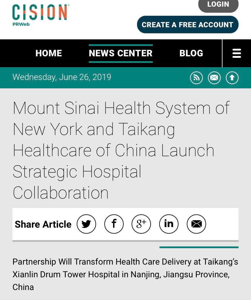 FierceHealthcare刊登我院与西奈山医院达成合作